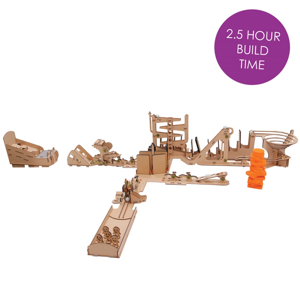 Kit includes engineered wood components, plastic pieces, plugs, straws, marbles, dominoes, rubber bands in assorted sizes, plastic hook and instructions. This activity will take approximately 2.5 hours to prepare and construct. Once assembled, children will develop analytical, creative and motor skills while learning about domino effect, force, momentum, gravity, elasticity and trajectories. Measures approximately 90cm x 1.7m when assembled. Plain for you to create. For 8 years plus. Adult supervision recommended. WHILE STOCKS LAST!
