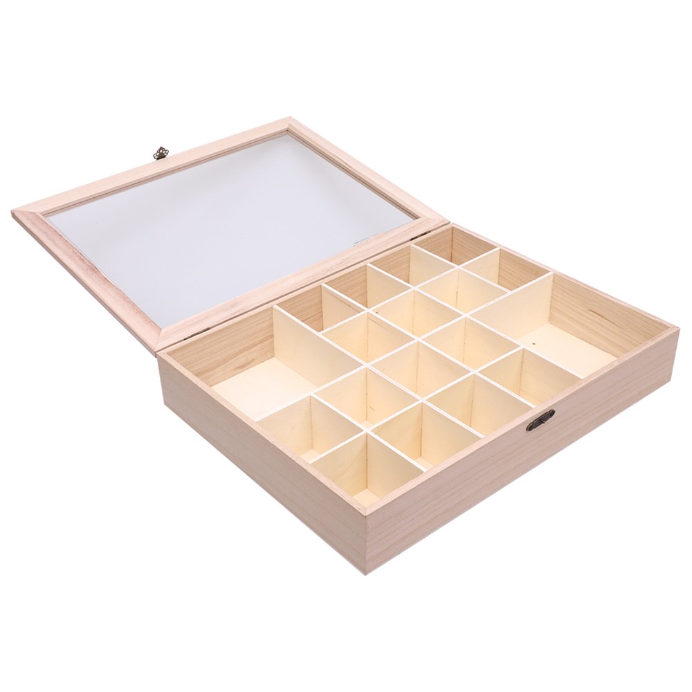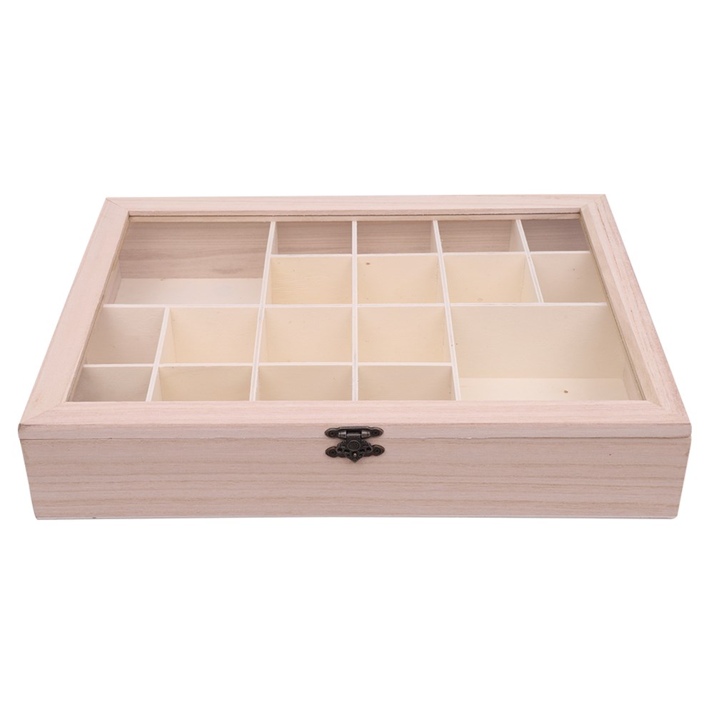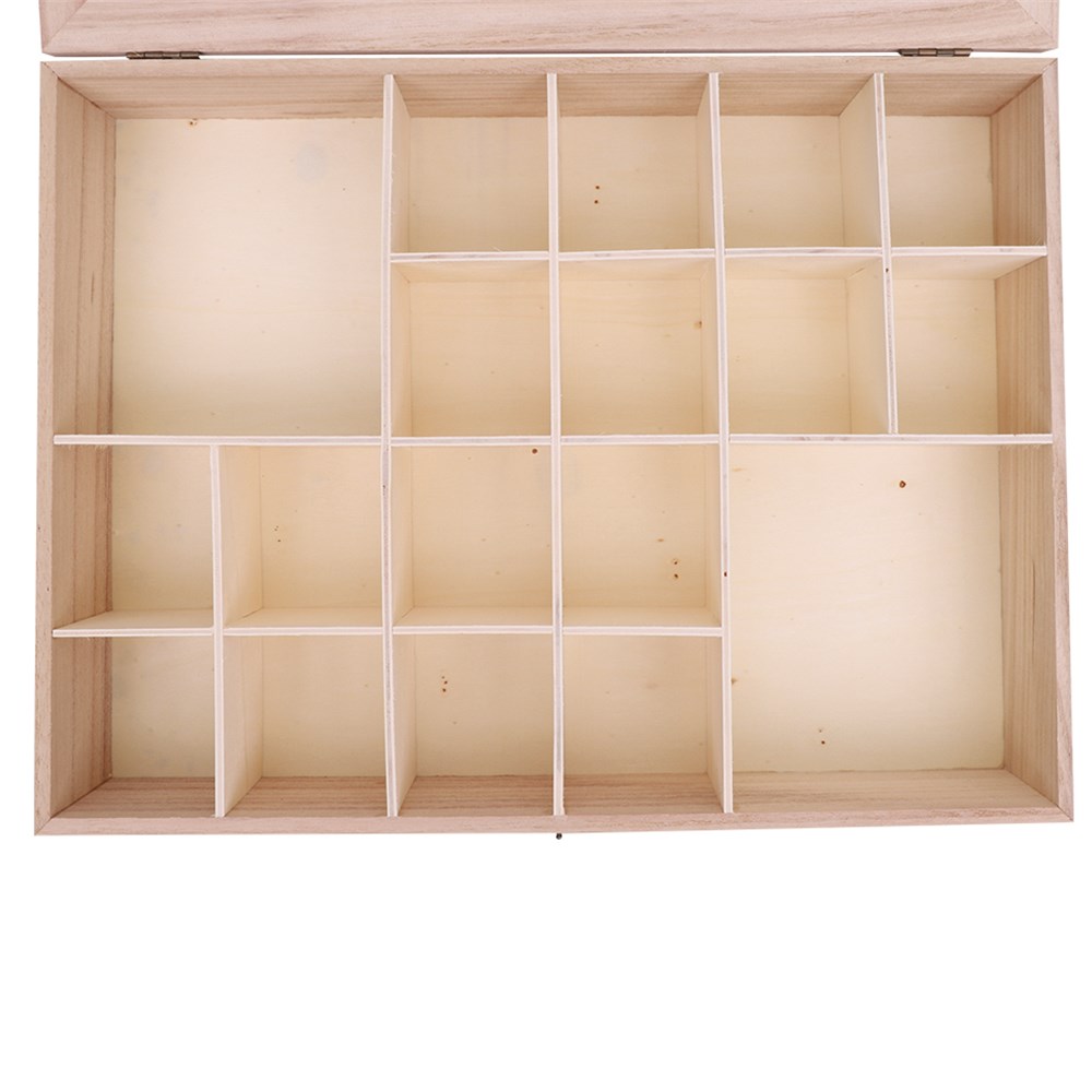 Plain for you to create. Metal latch included. No assembly required. Storage box measures 40 x 30 x 7.5cm. Includes 2 large compartments measuring 12.6 x 14cm and 16 small compartments measuring 6.2 x 6.8cm.