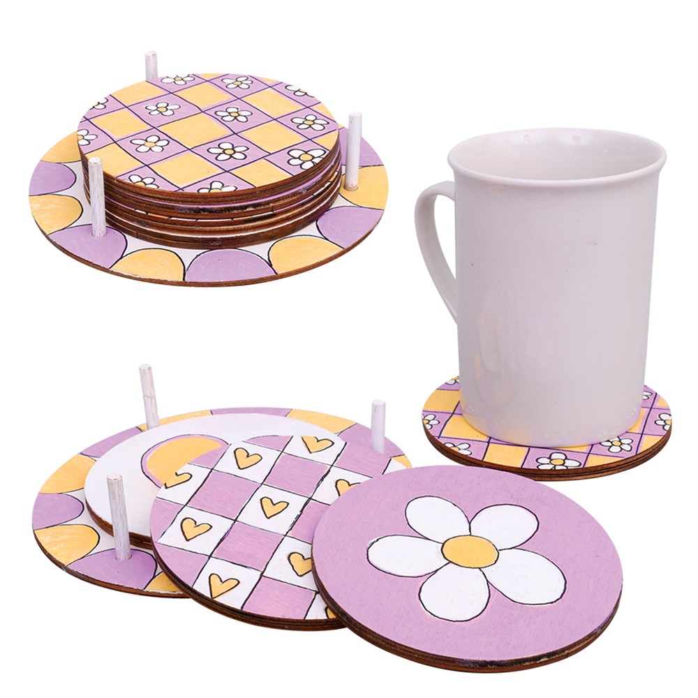 Simply glue the 3 dowels supplied into their allocated holes to create your coaster holder. Measures 14 x 3.5cm when assembled. Coasters measure 10cm in diameter. 6mm plywood coasters.