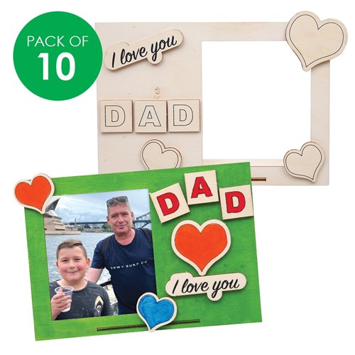 Each frame includes 10 pre-printed pieces for decorating (M, U, M, D, A, D, 'I love you' and 3 hearts in assorted sizes) plus a wooden frame and stand. Pieces supplied flat-packed and plain for you to colour, paint and decorate. Completed frame measures approximately 21 x 5 x 14.5cm. Space for photo measures 9.8 x 11.4cm. Made with 3mm plywood. Glue is required for assembly (sold separately).