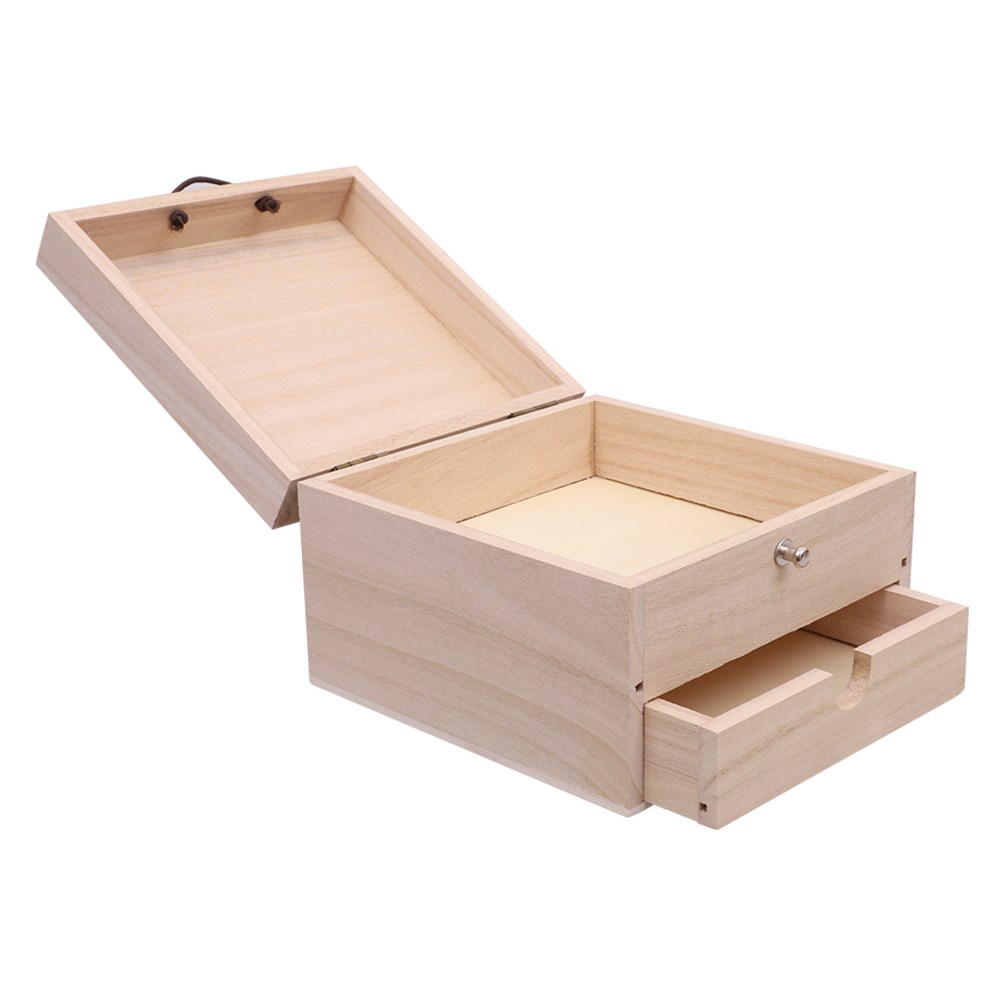 Plain for you to create. Elastic latch included for the top of the box. No assembly required. Measures 15 x 15 x 10cm. 7mm wood.