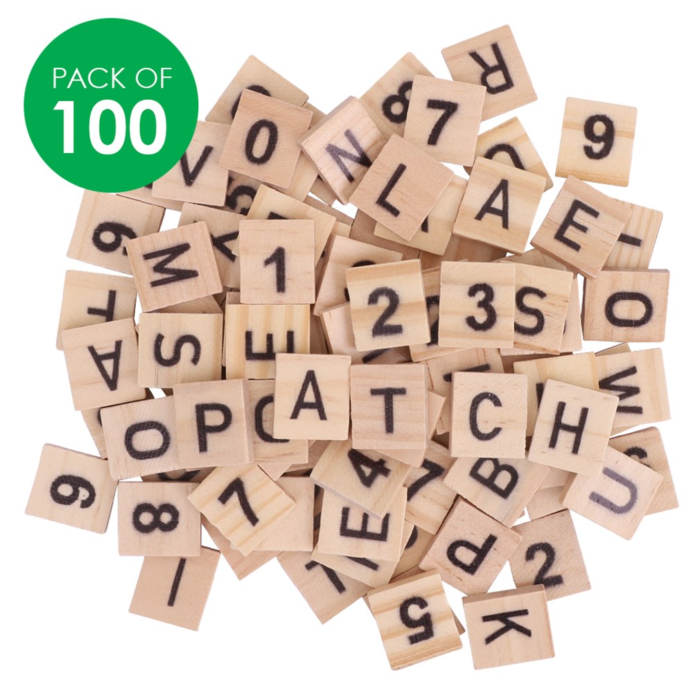 Wooden tiles featuring assorted letters and numbers. Each tile measures 1.8 x 2cm.