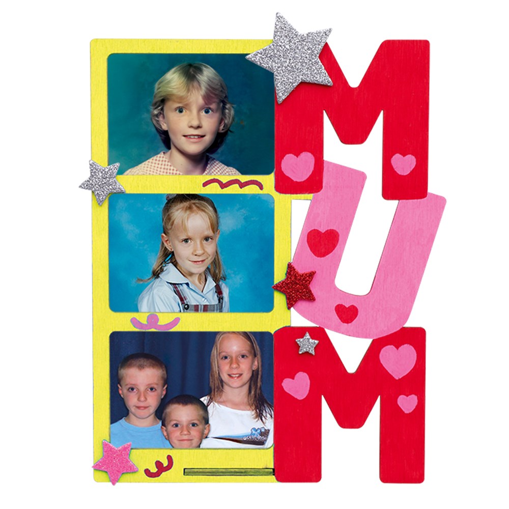 These wooden MUM photo frames are supplied flat-packed for easy self-assembly and plain for you to create. Each frame measures approximately 15.5 x 4.5 x 19cm when assembled. Spaces for photos measure 7 x 5cm. 3mm plywood.