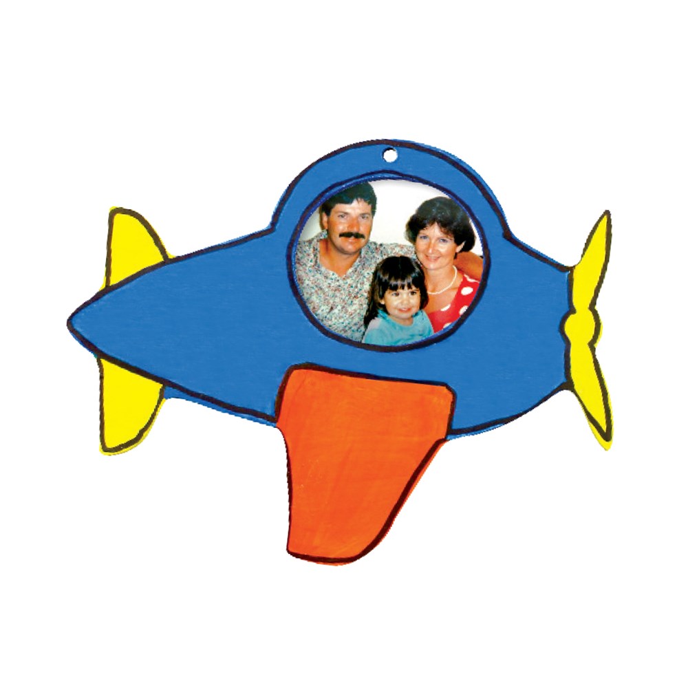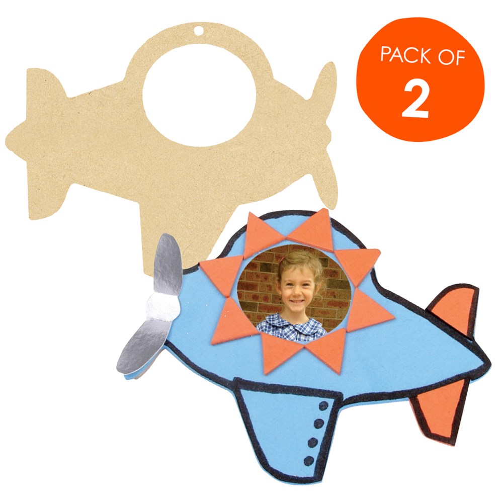 Wooden plane photo frames come plain for you to decorate. Each frame measures 11 x 9cm. Space for photograph measures 4 x 3cm. 3mm wood. Includes a hole for hanging. WHILE STOCKS LAST!