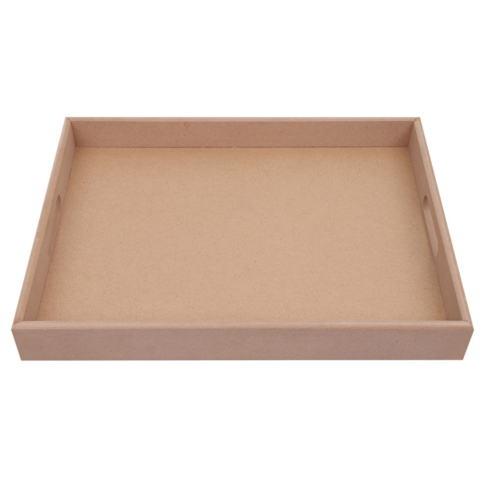 Plain for you to create. No assembly required. Measures 40 x 30 x 5cm. 9mm wood. Handle cutouts measure approximately 8 x 2cm.