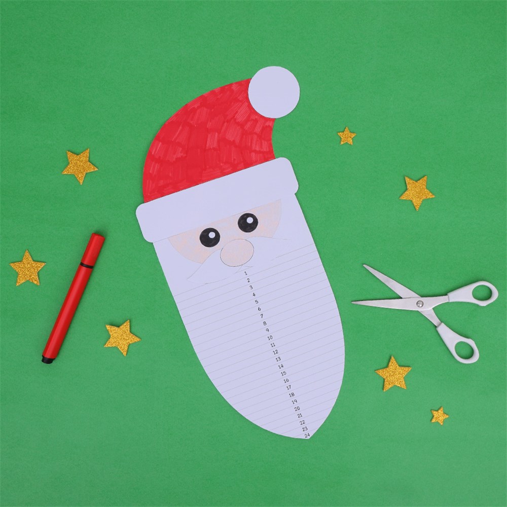 • Step 6Your Santa’s Beard Christmas Countdown is now ready! Hang your Santa up on the 1st of December. Starting on the 2nd of December, cut along the grey line of the bottom strip of Santa’s beard each day – the bottom number is the number of sleeps till Christmas!